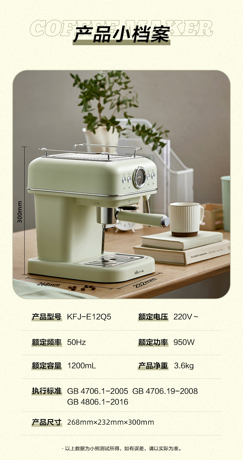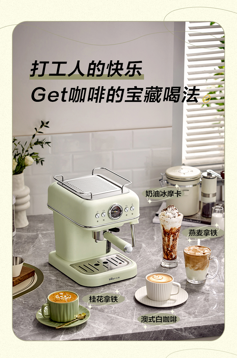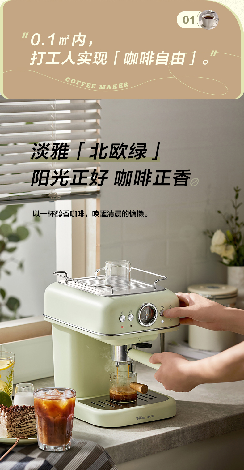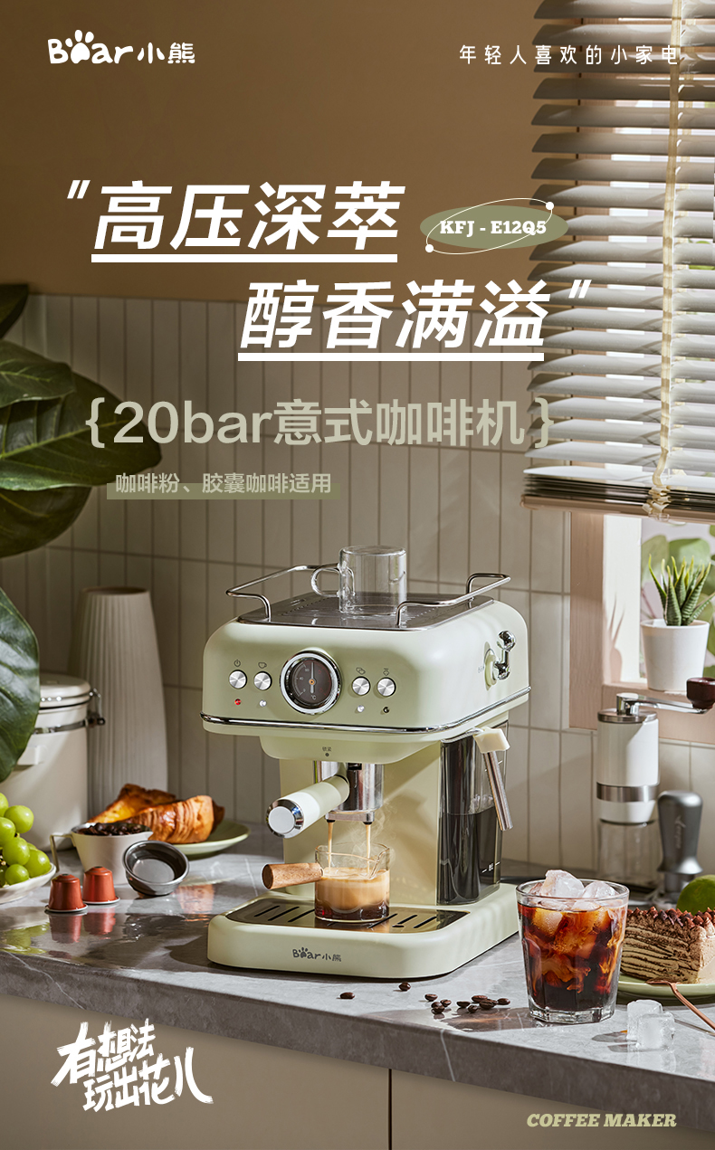 小熊(Bear)意式半自动 复古咖啡机小白可打奶泡 20Bar 高压萃取强劲蒸汽奶泡 【胶囊/咖啡粉两用】KFJ-E12Q5